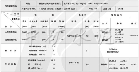 水泥袋装装车机由平形胶带机、卸袋机构、端部溜槽、中间溜槽等组成。平形胶带机的支架采用钢板折弯结构,即美观又牢固;驱动装置采用摆线针轮减速机,节省占地面积;张紧方式为中间垂直螺旋张紧。卸袋机构由转臂立式胶带机、电动推杆和支架三部分组成。当不需要水泥袋从中间位置卸下时,立式胶带机处于包装胶带机的侧边;当需要水泥袋从中间位置卸下时,由电动推杆拉动立式胶带机使其摆动与包装胶带机纵向成交叉位置,并开动立式胶带机即可。立式胶带机的两个摆动极限位置设有限位开关,在工作和非工作状态下的定位由限位开关来实现。特殊设计的溜槽能使水泥袋恰好落到胶带机的中心位置。